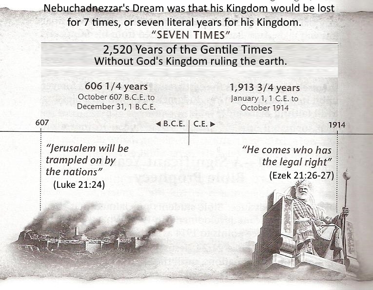 This prophecy used the term "seven times" instead of seven years. Comparing other scriptures, we learn a "time" can mean a year of 360 days (for prophetic use). At Revelation 12:6, we are told of a woman who was fed for a thousand two hundred and sixty days. Then at Revelation 12:14, we are told she is fed a time and times and half a time. Many Bible scholars of the late 1800's interpreted that "time and times and half a time" to be three and one half times. If three and one half times equals one thousand two hundred and sixty days, then this prophecy's seven times equals twice that, or two thousand five hundred and twenty days. Then applying a year for a day (Numbers 14:34) as in the seventy weeks prophecy, we get 2,520 years. The line of kings including faithful David represented God's kingship over the earth. Starting from when that kingdom was destroyed in 607 BCE, and counting forward 2,520 years, we arrive at 1914 CE when the one who has the legal right (*1)(Ezekiel 21:26-27) was to arrive. Christ, as both a descendant of King David and the son of God, (Luke 1:32-33) proved to be the one who has the legal right to the eternal kingship of the earth. (Eze 37:24-28) Thus, in the late 1800's, many Bible students asserted 1914 as the year for the arrival of Christ to establish his kingdom. When World War I broke out in that year, many persons throughout the earth placed faith in that Bible understanding of Daniel's prophecy. (*2)
