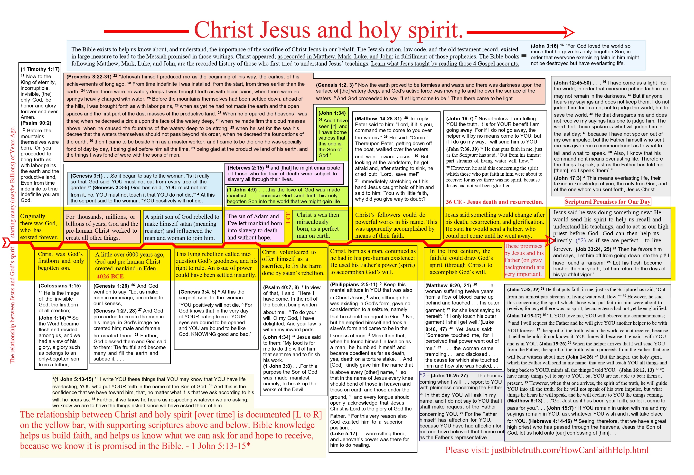 To read the graph, start about midway down on the left side where the yellow bar with a red arrow in the center runs horizontally to the right. Above and below the red arrow, within the yellow band, are the ways Holy spirit has been used. Above and below the yellow bar, and aligned with each point, either framed in a box and/or background highlighted, are supporting scriptures.