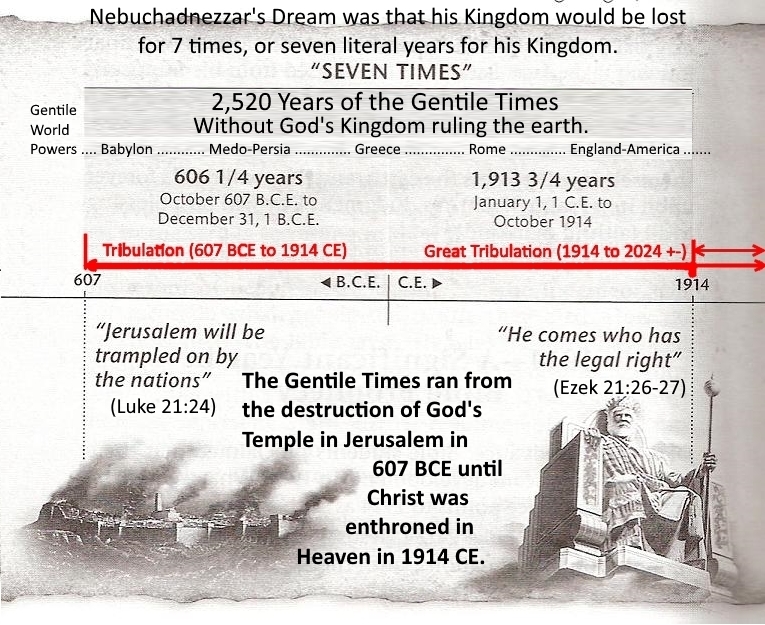 As to God's human kingdom over the earth being lost in 607, while the Israelites were able to return to their homeland in 455 BCE, 70 years after Jerusalem's destruction, they remained subservient to the Gentile Nations. God's human servants would not rule the earth again until Christ's enthronement in 1914. (Eze 37:24-28) Are you a member of the kingdom now ruling the earth? Do you even know what that means? Christ's Kingdom now rules in the hearts of faithful Christian men and women, and in God's eyes; but not in the opinion of this world. That is not changing! The Bible says, since Jesus started preaching and/or especially since his enthronement 1914, he has been subduing in the midst of his enemies... (Psa 110:2 of 1-3) He has used his followers to spread his words [the sword of his mouth] to subdue and destroy Satan's lies of control... (Rev 19:15-16 of 11-16; Rev 2:16) The second part, or greater tribulation, that "tribulation of the last days", which started in 1914, is very different from the tribulation "of those days" which started in 607 BCE. (Mat 24:8 of 3-8) As part of the Great Tribulation, the First World War broke out in 1914. Since then, there has been a string of huge and serious troubles. Jesus noted that would be [now is] an identifiably different tribulation from the "wars and rumors of wars" of previous generations. (Mat 24:4-6 of 3-14) The outbreak of the "great tribulation" likely corresponds with the angels releasing the four winds of destruction (Rev 7:1-3; Jer 25:32-33) previously held back, now to allow the tribulation our disobedience has created to run it course in fulfillment of God's purpose to destroy the wicked. Are you one being preserved alive while the wicked are destroyed? (Mat 24:36-39) [See: JustBibleTruth.com; Select: Sweet Dreams Are Made!]