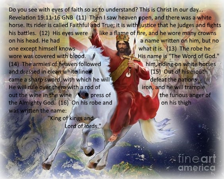 (12) His eyes are like a flame of fire, and on his head are many diadems, and he has a name written that no one knows but himself. (13) He is clothed in a robe dipped in blood, and the name by which he is called is The Word of God. (14) And the armies of heaven, arrayed in fine linen, white and pure, were following him on white horses. (15) From his mouth comes a sharp sword with which to strike down the nations, and he will rule them with a rod of iron. He will tread the winepress of the fury of the wrath of God the Almighty. (16) On his robe and on his thigh he has a name written, King of kings and Lord of lords.