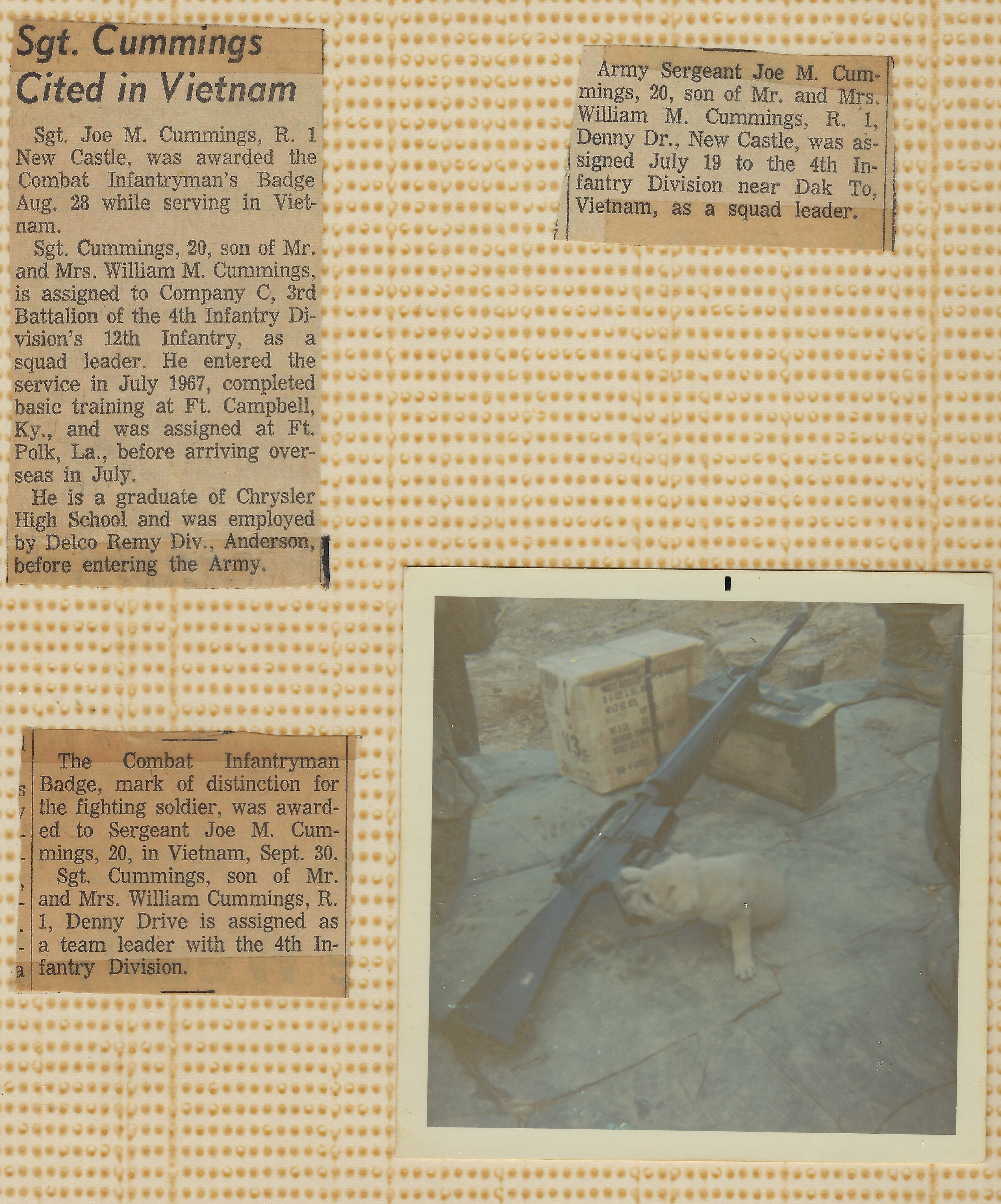 My little daughter Amanda, born after my return from the Nam, constructed a collage (which included the above page) with some of my childhood and teenage pictures in a photo album she put together to describe the life of her daddy; "before Amanda Kay." (Where the dog came from, I don't remember, nor do I remember what became of it. It was obviously not practical for us to keep a puppy. The chopper crews sometimes took a break on the hill. Maybe the dog was with one of them. He seemed to like my freshly cleaned rifle.) I guess when little Amanda thought of her dad's Vietnam days, she liked thinking of him with a puppy. In harmony with the Bible proverb: The love of a little girl for her daddy is the fifth thing "too wonderful" for me!!! [Pro 30:18-19]