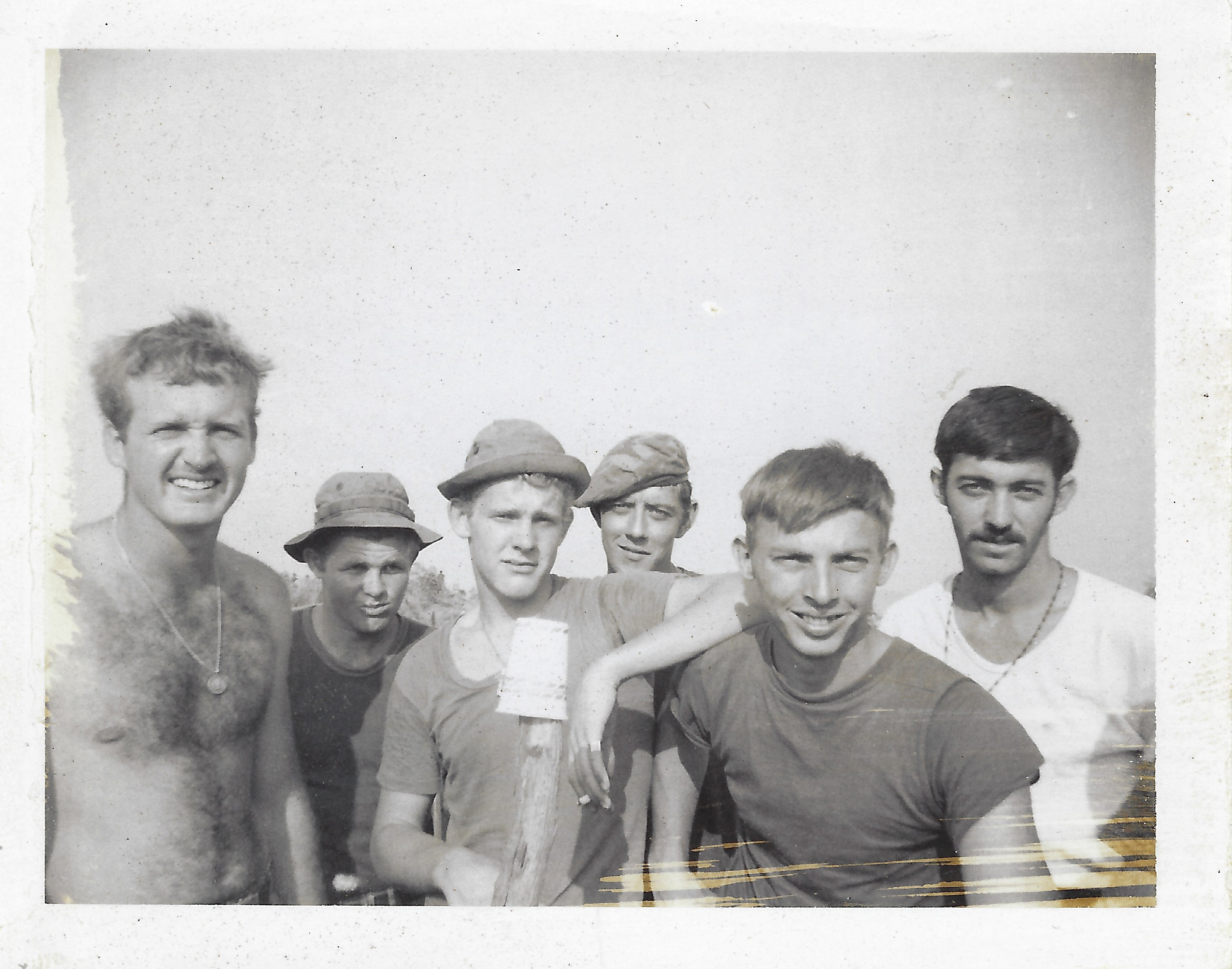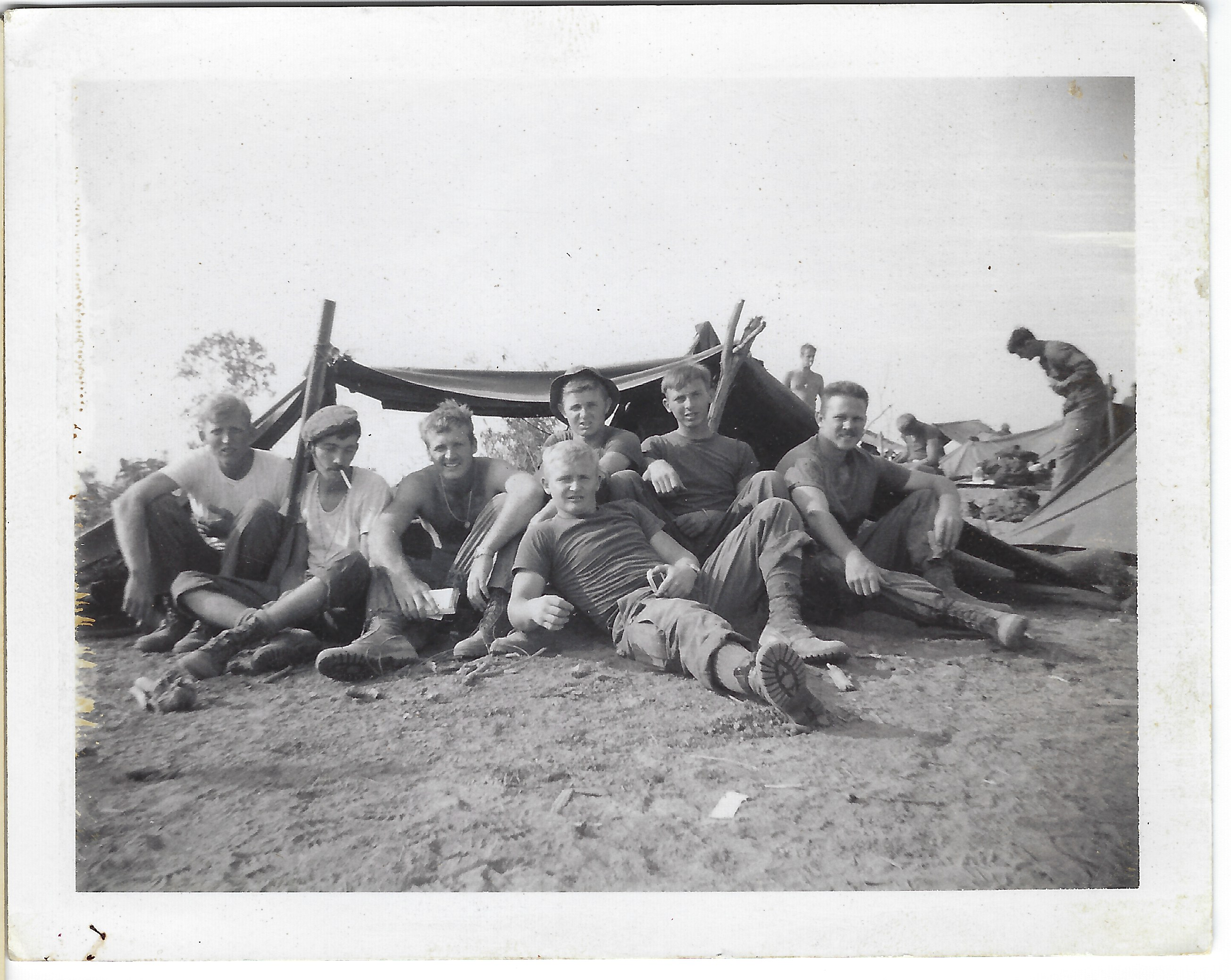 Joe Cummings left, then Chris Duar,* and Jim Spearman front and 2nd from right. Many of us who took pictures had our family make two copies and send one back so we could trade or give them to others to send home. Don't know who gave me this picture as it was a different format from my camera, but I sent it home as a "short timer" [most of my tour over] marked "39 days and a wakeup". Then, 40 days plus travel later, it was back home trying to return to the life I was so rudely yanked away from. Someone commented there was a lot of missing shirts for a military unit. We were in a combat unit that never saw anyone except NVA soldiers. It was hot!!! I never polished a boot and no one ever mentioned the dress code or worried about who was wearing a shirt. We did stay shaved and clean, however, and our weapons were oiled and spotless inside. One man told me his unit wore their underwear as shorts trying to beat the heat. We always had our loaded weapon in hand or at arms length and needed to be ready to fight. Missing shirt maybe, but short pants wouldn't have been practical for us.