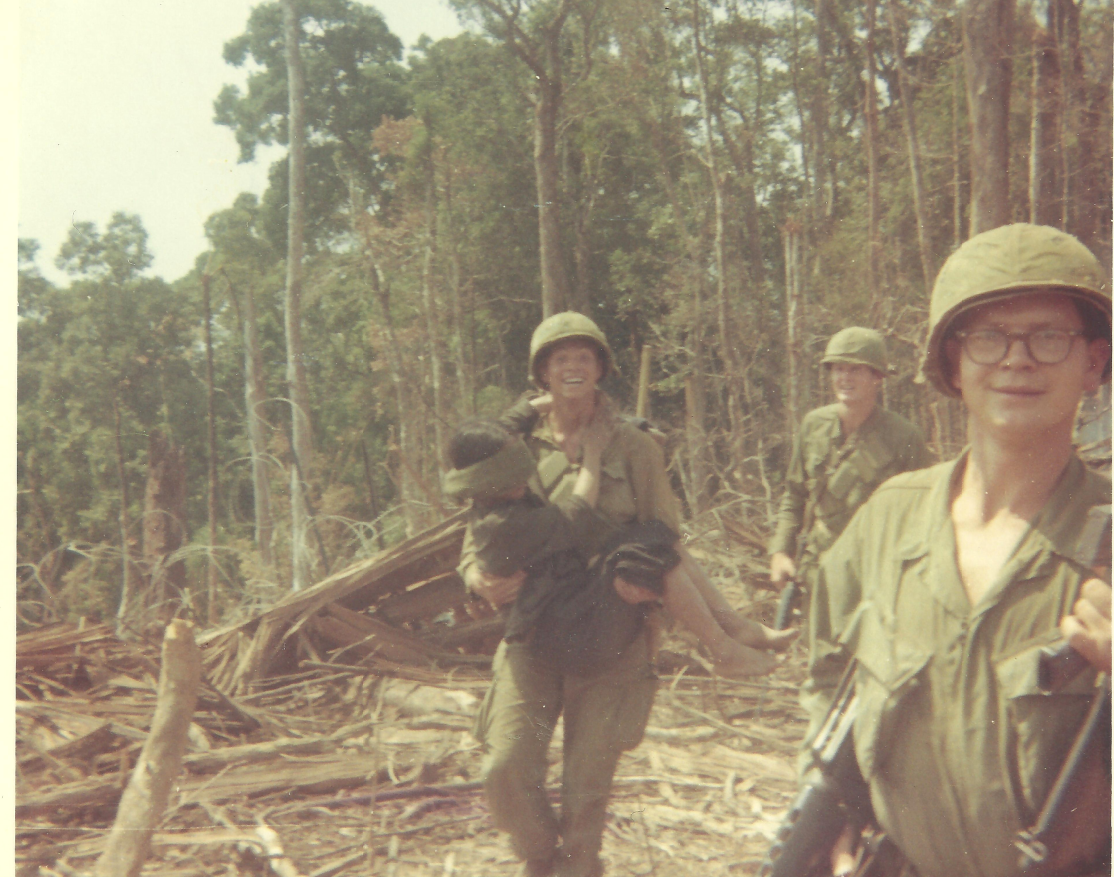 Tennessee left, Joe Cummings background, Max Worthington right. Returning from an expected one day mission outfitted with our "basic load." That meant we didn't carry our ruck sack with sleeping and personal gear. Just our combat gear which consisted of our weapon, 23 magazines of ammo [3 bandoleers of 7 mags each, one mag in the weapon, and 1 "fast grab" mag in a pocket or...], helmet, gas mask, some grenades [smoke and fragmentation], water and maybe one meal. Our company was chosen for this mission which turned out be be an unusual duty in a different area. We flew some distance to a new area of operations to carry it out. After securing this hill [the vegetation on the top of which was freshly blown off], we were joined by a Huey with 4 or 5 men asserting to be from military intelligence [M.I.]. Our Company C.O. selected our squad to carry them down to a local village, while he and the company secured the hill. He was obviously more concerned with securing his position on the hill than with the safety of our new M.I. friends. That was good; we needed someplace to come back to... My squad pulled security for our "visitors" while they conducted their business with the villagers. We then carried this girl back to the firebase and the M.I. guys took her out with them on their helicopter... We were then picked up by hueys and returned to our normal area of operations around Dak To. If I ever knew why all this happened, I don't remember. [One person suggested possible Vietcong ties and another thought maybe it was providing medical help for the daughter of someone powerful in the area. But, I'm pretty sure I would have remembered if I had known either to be the case.] Other than very occasionally passing some of them on a trail (and I think that happened only during the couple of weeks we pulled security for the artillery at the bridge between 4th Div. Base Camp and Dak To), this mission was the most involvement I had with South Vietnamese civilians. This and some other assignments made me feel like our company and platoon got picked for a lot of dangerous or unusual jobs. It made me a bit paranoid at the time; thinking someone up the chain of command was trying to get me killed. Retrospectively, I like to think it was because our platoon and my squad was viewed as being willing to get the job done, and capable...